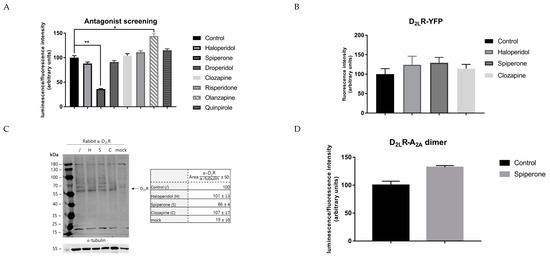 Secondly, to rule out a possible role for spiperone on the expression level of the D2LR, the receptor was fused to yellow fluorescent protein (YFP) and HEK293T cells transiently transfected with the fusion construct, and they were incubated with 10 µM of the D2R antagonists haloperidol, clozapine, and spiperone (Figure 3B). Incubation with these D2R antagonists did not cause any significant alteration in the level of fluorescent signal after 16 h of incubation. Similarly, a western blot experiment under reducing conditions was conducted to analyze the expression of the fusion proteins D2LR–SmBiT and D2LR–LgBiT in both cells that had been and had not been incubated with the antagonists (Figure 3C). The aim of this experiment was merely to evaluate whether there was an impact on D2LR expression. After normalization to tubulin as a housekeeping protein, a 14% decrease of D2LR fusion protein expression was observed in cells treated with spiperone, compared to the solvent-treated control. Under these (reducing) conditions, no clear bands of D2LR dimers or higher oligomers could be observed, which might be explained by the fact that lower densities of receptors in the plasma membrane could conceivably reduce the proportion of receptors forming dimers, as reported before [53].