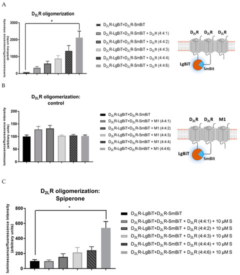 HEK293T cells transiently expressing higher levels of D2LR (fusion) proteins. (A) An increasing amount of native D2LR was co-transfected with D2LR–LgBiT and D2LR–SmBiT vectors. Higher expression levels of D2LR stimulate D2LR oligomerization. (B) An increasing amount of native muscarinic M1 receptor does not attenuate nor evoke higher luminescent signals evoked by D2LR dimerization. (C) Incubation of cells with 10 µM spiperone (S) results in a less pronounced increase of D2LR di- and oligomerization upon expression of increased levels of native D2LR. Experiments were performed three times in triplicate. (n = 3, ±SEM) (non-parametric Kruskal–Wallis one-way Anova, followed by post-hoc analysis (Dunn’s multiple comparison test), * p < 0.05).