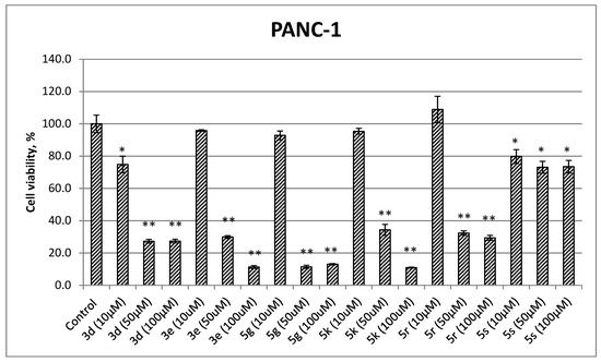 Cell viability MTT assay results for compounds 3d, 3e, 5g, 5k, 5r, and 5s at 10, 50, 100 µM concentrations against pancreas ductal adenocarcinoma (PANC-1) cell line (values are shown as the mean ± SEM of three experiments: (*) p < 0.05 and (**) p < 0.01 in comparison to control (0 µM)).