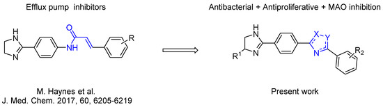 Considering this, intensive efforts have been made to find the possibility to specifically block the efflux function in prokaryotic cells. The latter effect, if achieved, causes the loss of the ability of bacteria to counter the effects of antibiotics, and thus restores the pathogens drug sensitivity [3,4]. A recent study based on this idea is the one reported by Heynes et al. who discovered a new class of efflux pump inhibitors in prokaryotic cells based on 2-imidazolines derivatives (Scheme 1) [5]. Although these compounds alone did not show pronounced antibacterial properties, they markedly potentiated the effect of Novobiocin on several E. coli strains, inhibiting the efflux pump expressed by these bacteria. Despite the intriguing activity exhibited by these compounds, the presence of amide moiety as the central “core” of the molecule can be considered a disadvantage of the newly discovered chemotype of inhibitors as they are expected to be rapidly hydrolyzed in vivo [6]. Thus, we came up with an idea to examine 1,2,4-oxadiazole ring as an alternative core for the promising 2-imidazoline-containing periphery, as it could provide novel two-heterocycles-hybrid based series of compounds for further diverse biological evaluation. These expectations were supported by several successful series of variously biologically active oxadiazoles synthesized and evaluated in our group [7,8,9,10], as well as by recent example of anti-MRSA (Methicillin-Resistant Staphylococcus aureus) and anti-VRE (Vancomycin-Resistant Enterococcus) active antibiotics incorporating 3-phenoxyphenyl-substituted 1,2,4-oxadiazoles, that have been recently reported [11,12,13,14,15,16,17].