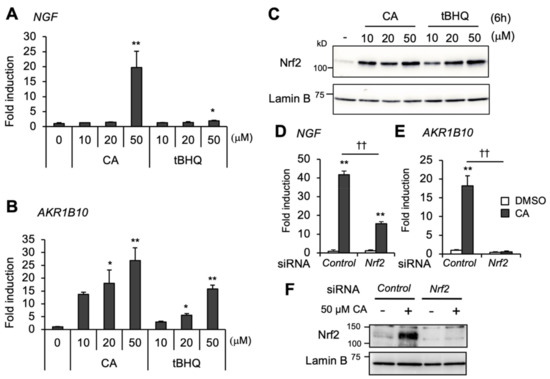 High-dose CA regulates NGF gene expression beyond Nrf2 activation. CA and tBHQ induction of (A) NGF and (B) AKR1B10 genes in U373MG cells. Fold gene inductions were evaluated by reverse transcription-quantitative polymerase chain reaction (RT-qPCR) (vehicle control dimethyl sulfoxide (DMSO) = 1). The results are presented as the mean ± SE (n = 3); significant differences from the vehicle control (DMSO) are indicated by asterisks (* p < 0.05; ** p < 0.01), by one-way analysis of variance (ANOVA) with Tukey–Kramer post hoc test (n = 3). (C) Nuclear accumulation of Nrf2 protein in response to varying doses of CA or tBHQ was evaluated by immunoblot analysis. Lamin B blot was used as a loading control. (D) Effect of Nrf2 knockdown on the CA induction of NGF and (E) AKR1B10. siRNA-transfected cells were treated with either DMSO (open bars) or 50 μM of CA (closed bars) for 24 h. Fold gene inductions were evaluated by RT-qPCR (control siRNA/DMSO = 1). The values are normalized with cyclophilin A expression and presented as the mean ± SE of three independent experiments. Significant differences between DMSO and CA are indicated by asterisks (** p < 0.01), and daggers indicate significant differences between control siRNA or Nrf2 siRNA with CA (†† p < 0.01) by one-way ANOVA with Tukey–Kramer post hoc test (n = 3). (F) Nrf2 protein level in Nrf2 knockdown cells. Either control (Ctrl) or Nrf2 siRNA-transfected cells were treated with DMSO or 50 μM of CA for 6 h, then nuclear Nrf2 protein levels were visualized by immunoblot analysis.