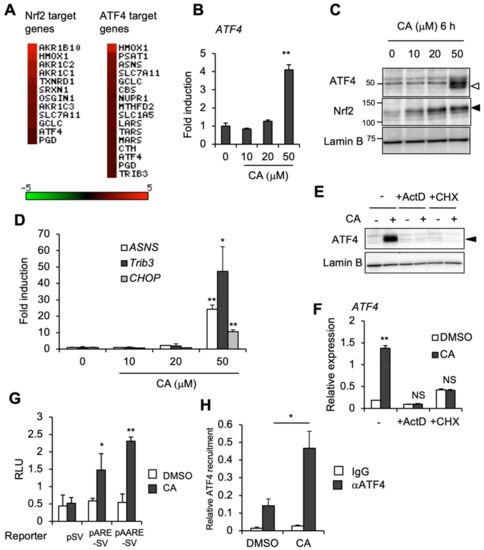 CA activates the ATF4 pathway in a dose-dependent manner in U373MG cells. (A) Heat map representation of genes induced by 50 μM of CA in U373MG cells. The fold induction (CA vs. DMSO) was plotted based on microarray data. (B) Dose-dependent induction of ATF4 mRNA. ATF4 mRNA expression was evaluated by RT-qPCR and presented as the mean ± SE from three independent experiments. Each value was normalized to cyclophilin A expression. The asterisks indicate a significant increase compared with the 0 h control (** p < 0.01 by one-way ANOVA with Tukey–Kramer post hoc test). (C) CA dose-dependent induction of ATF4 and Nrf2 proteins. U373MG cells were administered 10 to 50 μM of CA for 6 h. An aliquot of nuclear extract was subjected to immunoblot analysis. White and black triangles indicate ATF4 and Nrf2 bands, respectively (D) CA dose-dependent induction of ATF4 target gene; mRNA expression of ASNS, Trib3, and CHOP was evaluated as described in (B). The asterisks indicate a significant increase compared with the control (0 μM) (* p < 0.05; ** p < 0.01 by one-way ANOVA with Tukey–Kramer post hoc test). (E) U373MG cells were pretreated with DMSO (-), 1 μg/mL actinomycin D (ActD) or 1 μg/mL cycloheximide (CHX) for 30 min, followed by DMSO or 50 μM of CA for 6 h for immunoblot analysis or (F) 24 h for RT-qPCR analysis. Black triangle indicates ATF4 band. The asterisks indicate a significant difference between DMSO- vs. CA-treated samples (** p < 0.01; NS not significant by one-way ANOVA with Tukey–Kramer post hoc test). (G) AARE-luc reporter gene activation by CA. U373MG cells were transfected with either pSV-Luc (pSV), pARE-SV-Luc (pARE-SV), or pAARE-SV-Luc (pAARE-SV) reporter vector and then incubated for 24 h in the presence of DMSO (open bars) or 50 μM of CA (closed bars). The firefly luciferase activities were normalized to Renilla luciferase activities and presented as relative luciferase units. The values are presented as the mean ± SE. The asterisks indicate a significant increase compared with the DMSO control (* p < 0.05; ** p < 0.01 by Student’s t-test (n = 3)). (H) CA-dependent ATF4 accumulation with the AARE sequence of human ASNS gene. U373MG cells were treated with either DMSO or 50 μM of CA for 6 h and then subjected to ChIP analysis using control IgG (IgG) (open bars) and anti-ATF4 antibody (αATF4) (closed bars). The relative accumulation levels of ATF4 to the ASNS gene AARE are presented as the mean ± SE. The asterisks indicate a significant increase compared with the DMSO control (* p < 0.05 by Student’s t-test).