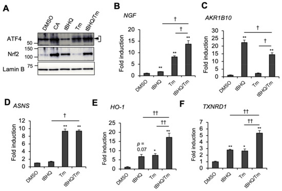 tBHQ and Tm cooperatively modulate NGF and antioxidant gene expression. (A) ATF4 and Nrf2 protein induction by tBHQ and/or Tm. U373MG cells were treated with DMSO or 50 μM of tBHQ and/or 2 μg/mL of Tm for 6 h, and an aliquot of the nuclear fraction was then subjected to immunoblot analysis. Black triangle indicates nonspecific band in smeared ATF4 band. (B) Gene expression of NGF, (C) AKR1B10, (D) ASNS, (E) HO-1, and (F) TXNRD1 in response to tBHQ and Tm was evaluated by RT-qPCR analysis. U373MG cells were treated with tBHQ and/or Tm for 24 h. These values were normalized to cyclophilin A expression and presented as the mean ± SE from three independent experiments. The asterisks indicate significant differences from DMSO (* p < 0.05; ** p < 0.01), and the daggers indicate significant difference between tBHQ or Tm and tBHQ/Tm († p < 0.05; †† p < 0.01) by one-way ANOVA with Tukey–Kramer post hoc test (n = 3).
