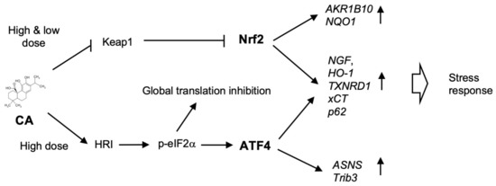 Hypothetical scheme of CA action in mammalian cells. CA activates the Nrf2 pathway only at a low dose (≤20 μM) but activates both Nrf2 and ATF4 pathways at a high-dose (≥50 μM). Induced Nrf2 and ATF4 independently and cooperatively up-regulate CA-inducible gene expression (arrows pointing up) to exhibit physiological effects, such as stress response (bold white arrow). The arrows indicate activation and T-arrows show inhibition.