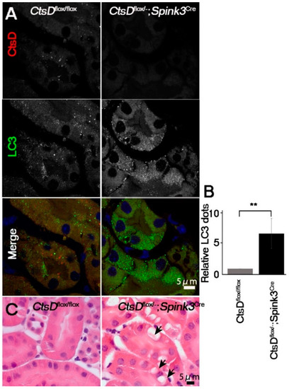 It has been reported that LC3 (a marker for autophagosome/autolysosome)-positive signals are increased in the cathepsin D-deficient neurons because of a defect in the autophagy-lysosome system [4,5,8]. We therefore investigated whether or not LC3 increased in the cathepsin D-deficient renal tubular epithelial cells (Figure 2). LC3-positive dots were significantly increased in the cathepsin D-deficient renal tubular epithelial cells, while only little expression was detected in the CtsDflox/flox cells.