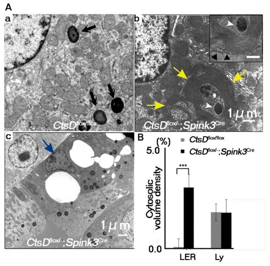 In neurons, lack of cathepsin D results in the accumulation of autophagosomes, autolysosomes, and abnormal membranous structures (autolysosome-like electron-dense structures surrounded by lamellarly and concentrically arranged endoplasmic reticula (LER)) [4,18,19]. This accumulation of autophagosomes and autolysosomes has been correlated with increases in LER due to the impairment of lysosomal function [4,19]. We therefore used electron microscopy to investigate whether or not abnormal intracellular membranous structures were accumulated in the cathepsin D-deficient renal tubular epithelial cells of the cortico-medullary region. Electron microscopic analyses of the renal tubular epithelial cells in the cortico-medullary region of the CtsDflox/−; Spink3Cre mouse indicated that these cells contained autolysosome-like, electron-dense structures surrounded by LER (Figure 3A). Quantification, using the point-counting method [20], revealed that LER are significantly increased in cathepsin D-deficient renal proximal tubular epithelial cells (Figure 3B). Interestingly, large vacuolar structures were observed in some cathepsin D-deficient renal proximal tubular epithelial cells (Figure 2C and Figure 3Ac).