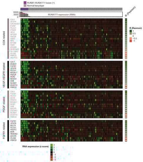 Heat Map of genes with altered expression correlating to RUNX1T1 expression. Genes relevant to the COX, VEGF-vascular endothelial growth factor receptor (VEGFR), PDGF, and FGFR1 related pathways were found to be altered in AMLs with RUNX1-RUNX1T1 fusion, among a total of 293 genes with over- or under-expression, compared to normal karyotype AML patients. Pathways with q value < 0.1 were selected and merged based on the pathway ontology.