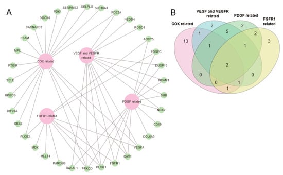 Schema of genes involved in multiple pathways. (A) Genes relevant to cyclooxygenase (COX), VEGF-VEGFR, PDGF, and FGFR1 related pathways are shown, and some of the genes are related to more than one pathway. (B) Venn diagram of the number of genes participating in each pathway. PRKCD and PLCG1 participated in all four pathways.