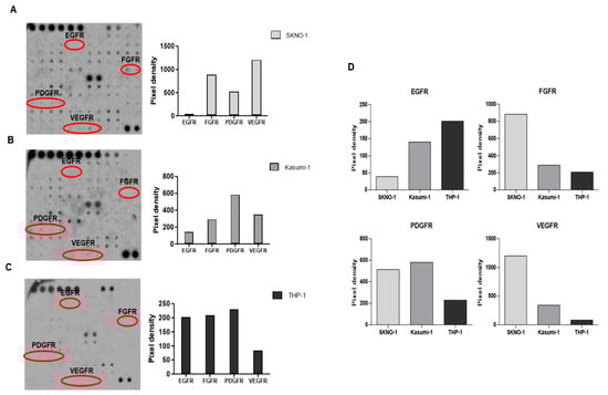 Phosphorylation status of various tyrosine kinase receptors in SKNO-1 (A), Kasumi-1 (B), and THP-1 (C) cells. Red circles indicate EGFR, FGFR, platelet-derived growth factor receptor (PDGFR), and VEGFR spots. (D) Bar graphs compare the levels of phosphorylation of EGFRs, fibroblast growth factor receptors (FGFRs), PDGFRs, and VEGFRs of the three cell lines. The three of membrane images are edited for removing background at the same level using ImageJ software.