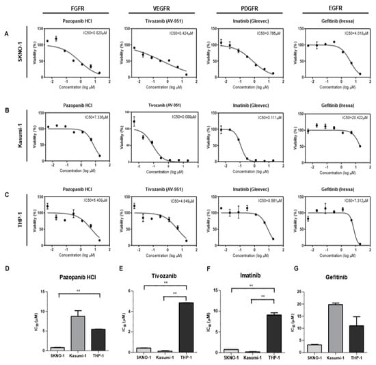 Drug response curves for leukemia cell lines. Various concentrations of pazopanib HCl, tivozanib, Imatinib, and gefitinib were treated with SKNO-1 (A), Kasumi-1 (B), and THP-1 (C) cells to inhibit the activities of FGFR, VEGFR, PDGFR, and EGFR, respectively. (D–G) Bar graphs compare the IC50 values of three cell lines for each inhibitor. ** p < 0.01.