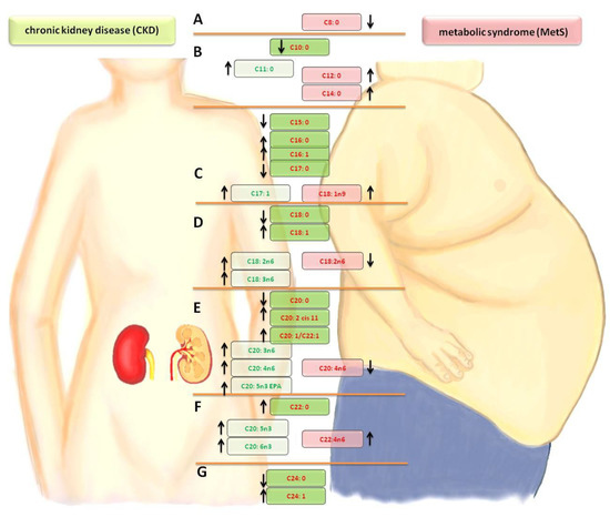 Comparison of changes in the fatty acid profiles in the CKD and MetS groups. A— lowering short-chain FA. B—saturated fatty acid (SFA) elongation. C—mono-unsaturated fatty acid (MUFA) growth at the expense of SFA/palmitic acid derivatives. D—stearic acid derivatives/synthesis of the n-6 family in CKD. E—cascade of arachidonic acid/synthesis of the n-3 and n-6 families. F—increased synthesis of the n-3 and n-6 families. G—synthesis of nervous acid. Arrow- direction of change (increase or decrease in level fatty acid relative to the control group)