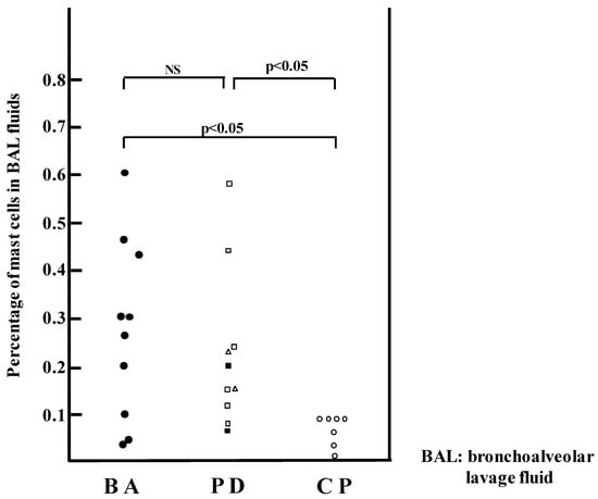 Percentage of mast cells in BAL fluids in asthmatics (BA: ●), patients with other pulmonary diseases (PD): interstitial pneumonia (□), sarcoidosis (△), and chronic obstructive pulmonary diseases (■), and control patients (CP: ○). (Bars indicate SEM). The figure was modified from reference [11] with permission: Tomioka et al., Mast cells in bronchoalveolar lumen of patients with bronchial asthma. Am. Rev. Respir. Dis. 1984, 129, 1000–1005.