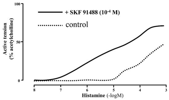 Effect of SKF 91488 and aminoguanidine on contractile response of human bronchi to histamine. Dose–response curves to histamine in SKF 91488 (10−4 M) and control are analyzed. Data are expressed as percentage of response to acetylcholine (10−3 M). Histamine N-methyltransferase (HMT) regulates contraction of airway smooth muscle by histamine. HMT in epithelium degrades histamine actively. The figure was modified from reference [19] with permission: Yamauchi et al., Structure and function of human histamine N-methyltransferase: critical enzyme in histamine metabolism in airway. Am. J. Physiol. 1994, 267, L342–L349.