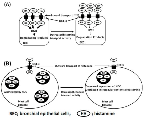 Recently, a novel function of H2R in inhibiting proinflammatory responses in the lung was elucidated using H2R genetic deficiency and the administration of an H2RA, famotidine [38]. H2RA treatment or H2R-deficient animals showed increased numbers of CD1d+ dendritic cells and iNKT cells, resulting in inflammatory cell recruitment, and Th2 cytokine productions and secretion such as IL-4 and IL-5, while dimaprit, a selective H2R agonist, inhibited the lung iNKT cell responses [38]. Furthermore, the OCT-3 functions are more complicated in terms of the bidirectional transport system of OCT-3; inward histamine transport system in bronchial epithelial cells expressing HMT is critical for the clearance and inactivation of histamine. On the other hand, in the outward histamine transport system in professional histamine-producing cells such as mast cells and basophils expressing histamine-producing enzyme, histidine decarboxylase (HDC) regulates the intracellular contents of histamine through homeostatic mechanisms [39] (Figure 4A,B).