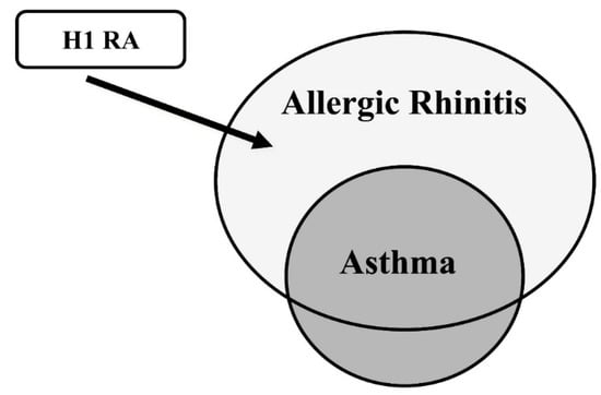 Bronchial asthma and allergic rhinitis (AR) are thought to share a common pathogenesis. More than 60 percent of patients with adult asthma showed symptoms of AR and were diagnosed with AR. In addition, asthma and AR symptoms often co-occur in patients with asthma and AR (Table 2) [64]. H1RAs are recommended for AR in clinical guidelines. In this regard, asthmatics with AR may represent a promising subtype in which H1RAs may be very effective on both asthmatic and AR symptoms (Figure 7). Allergic asthmatics are thought to represent more than 70% of total asthmatics. Therefore, asthmatics with AR are a large subtype.