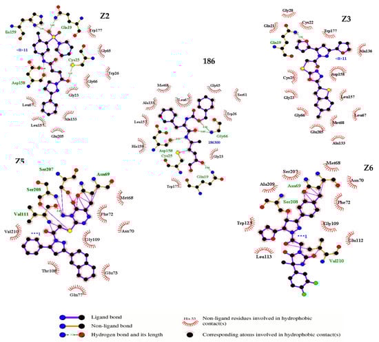 Amino acid interactions of the four (Z2, Z3, Z5 and Z6) selected compounds and the reference ligand 186 on Cz. In the five figures, arcs with red lines represent hydrophobic amino acid contacts, green dashed lines represent hydrogen bonds and purple lines represent covalent bonds between protein and ligand or “elastic” bonds within the ligand. The image was produced with LigPlot software.