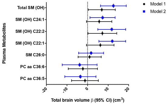 Sphingolipids are major lipids in the myelin sheath that are critical for the proper functioning of both the central and peripheral nervous system. SM (OH)s, hydroxyl derivatives of SMs, are particularly important for long-term stability of the myelin sheath, where their deficit leads to late onset demyelination and neurodegeneration [,]. This study built upon the previous established favorable associations between these three plasma SM (OH)s and cognitive [] and physical function [] by further linking them positively to brain morphology (total brain volume). The strong and positive correlations between higher plasma SM (OH)s and higher total brain volume (less brain atrophy) are consistent with the abundance of SM (OH)s detected in the brain [].