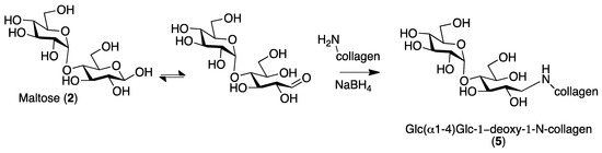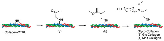 As proof of concept, glucose, usually present on collagen as natural O-glycosylation, has been selected. The neoglycosylation protocol will generate a β-glucosidic linkage with N-methoxyamino-collagen. Considering that the exposed glucosidic residue with α or β anomeric configuration, can induce different cell fates, maltose (Glcα1-4Glc), has been also used in order to generate collagen exposing an α-Glc residue (Figure 1).