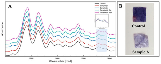 Fourier transform infrared (FTIR) spectroscopy was used to compare the different reaction steps (Figure 2A). The absorbance spectra are comparable for all the samples analyzed. Collagen samples show characteristic FT-IR spectra, with absorption bands of amide I at ∼1650 cm−1 and amide II at ∼1560 cm−1 [13]. In Samples 3 and 4, a slight increase in the ranges of carbohydrate moiety between 1000–1200 cm−1 is noticeable, in particular the typical peak of glucose at 1040 cm−1 [13]. Ninhydrin assay has been also performed in the first step to have a fast qualitative method to characterize the success in the insertion of keton groups on the collagen surface (Figure 2B) [14].