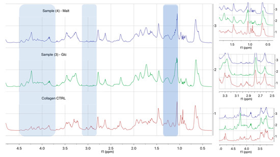 1H-NMR spectroscopy (Figure 3) displayed the presence of peaks between 2.9 and 3.0 ppm, assigned to the methylene hydrogen of lysine amines that disappear once obtained collagen neoglycosylation for Samples 3 and 4 and the introduction of new signals: One between 1.0–1.2 ppm, attributable to the CH3-CHNH of the linker, and a second one around 4.2–4.3 ppm, attributable to the CH3-O-NH of the linker, downfield shifted probably for spatial interactions with collagen functional groups. It is also worth noting that the small number of glycans available for the analysis and the heterogeneous nature of the samples presented difficulties regarding sensitivity by NMR. However, the presence of glycans on Samples 3 and 4 can be also be observed in the additional increment of the signals in the spectra between 4.0 and 4.5 ppm, in particular at 4.3–4.4 ppm.
