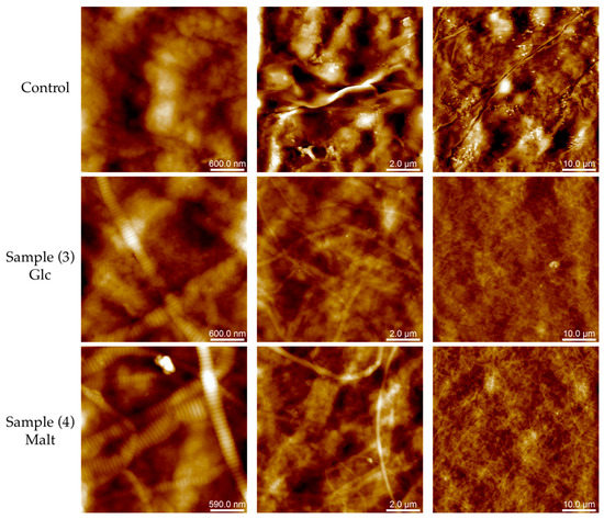 Regarding the structural assembly of collagen films, analyzed by atomic force microscopy (AFM), both neoglycosylated collagen samples and pristine collagen reveal significant fibrillation, while the pristine collagen (CT) showed an amorphous surface. As highlighted in Figure 4, Sample 3 and Sample 4 present well-defined fibrils, having respectively pitches of 68 ± 5 nm (Sample 3) and 72 ± 2 nm (Sample 4), regardless of the width of the fibril (see Figures S1 and S2).