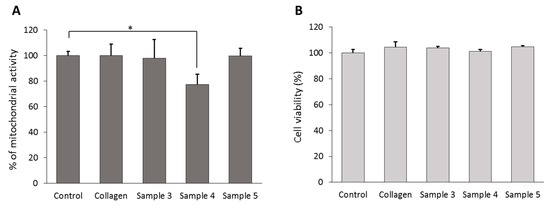 SH-SY5Y human neuroblastoma cells were cultured in DMEM (Gibco, ThermoFisher Scientific, Milan, Italy) supplemented with 10% FBS (Euroclone, S.p.A., Milan, Italy), 2 mM L-glutamine (ThermoFisher Scientific), and 1% penicillin-streptomycin (ThermoFisher Scientific). Cells were maintained at 37 °C, 5% CO2, and at saturated humidity. To test collagen biocompatibility with SH-SY5Y cells, a film of collagen, sample 3, 4, or 5 was placed in each bottom of a 24-well plate, washed in 70% ethanol and sterilized by UV irradiation. SHSY5Y cells were grown for 48 h on collagen films (5 × 104 cells/well) and then MTT and LDH assays were performed according to the manufacturer’s protocols. Cells grown on plastic (in absence of collagen film) were used as controls. Optical density values were measured using a SPECTROstar Nano spectrometer (BMG LABTECH, Euroclone Spa, Milan, Italy). Three replicates were used for each condition.