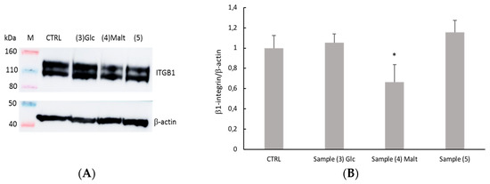 In order to study the biocompatibility of neoglycosylated collagen films, preliminary biocompatibility assay was performed on a human SH-SY5Y neuroblastoma cell line. All the tested neoglycosilated films showed comparable biocompatibility, even though SH-SY5Y cells grown on Sample 4—Malt—showed reduced mitochondrial activity compared to the other samples. The observed alteration of cell metabolic activity could be related to the decrease of ITGB1 expression.