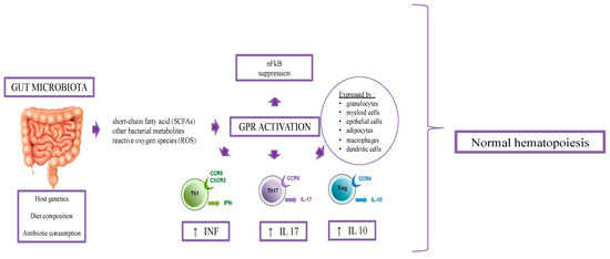 GM seems to have an impact on the products of the hematopoietic systems. Although the underlying mechanisms are unclear, the pool of the bone marrow myeloid cells is strongly correlated with GM composition [19]. Balmer et al. [37] compared the number of myeloid cells, mature monocytes, and granulocyte-monocyte progenitor between germ-free mice and specific pathogen-free (SPF) mice. SCFAs also play a fundamental role in the hematological setting: the product activates several G-protein-coupled cell surface receptors, such as GPR43, GPR109a, and C4, expressed by granulocytes, some myeloid cells epithelial cells, adipocytes, macrophages, and dendritic cells. As discussed above, SCFAs promote the generation of Th1, Th17, and IL-10+ cells and decrease the proliferation of T and B cells (Figure 1) [19].