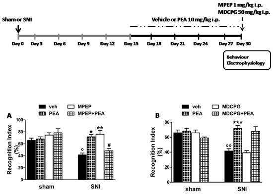 Effect of a single administration of vehicle, MPEP (1 mg/kg, i.p.), MDCPG (50 mg/kg, i.p.) on discriminative memory in sham and SNI mice receiving a 15-day treatment with vehicle or PEA (10 mg/kg, i.p.) 15 day after the sham or SNI surgery (day 0). The upper panel shows the experimental design and timeline of the sham or SNI surgery, the chronic treatment with vehicle or PEA and the single administration of vehicle, MPEP or MDCPG. (A,B) show the effect of vehicle, MPEP (A) or MDCPG (B) on the recognition index (RI) in sham or SNI receiving a chronic treatment with vehicle or PEA (10 mg/kg, i.p.). The administration of vehicle MPEP or MDCPG was carried out 1 h before the acquisition trial. Data are represented as the mean ± SEM of six mice per group. ° indicates significant differences vs.sham/veh, * indicates significant differences vs. SNI/veh and # indicates significant differences vs.SNI/PEA in SNI mice. p < 0.05 was considered statistically significant.