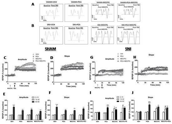 Effect of intra-LEC microinjection of vehicle or MDCPG (100 nmol) on the LTP at the LEC-DG pathway in sham and SNI mice treated with vehicle or with PEA (10 mg/kg, i.p.) for two weeks. (A,B) show sample traces of a single evoked fEPSP recorded in the DG during baseline, after MDCPG (100 nmol) microinjection into the LEC or TBS application in both, sham (A) or SNI (B) mice treated with vehicle or PEA. (C,D,G,H) show time-dependent changes in the amplitude (C,G) and slope (D,H) of fEPSPs after vehicle or MDCPG (100 nmol) microinjection in vehicle or PEA-treated sham (C,D) or SNI (G,H) mice. (E,F,I,J) show the average of normalized amplitude (E,I) and slope (F,J) of fEPSPs at different time points (0–15, 15–30 and 60–90 min) after microinjection of MDCPG (15–30) or TBS application (60–90) normalized to basal responses in vehicle or PEA-treated sham (E,F) or SNI (I,J) mice. Data are represented as mean ± SEM of the amplitude and slope of fEPSPs. ° Indicate significant differences vs. pre-TBS (15–30 min), * indicates significant differences vs. vehicle-treated mice, # indicates significant differences vs. PEA-treated mice and § indicate significant differences vs.MDCPG microinjection. p < 0.05 was considered statistically significant. Vertical and horizontal scale bars indicate 1mV and 5ms, respectively. Grey arrow indicates intra-LEC MDCPG microinjection and black arrow indicates TBS application.