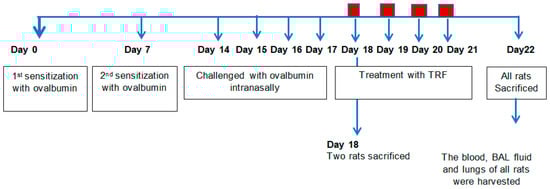 Fifty female Brown Norway rats were randomly assigned into five experimental groups (10 rats per group based on power of calculation) according to the study design conducted by Wagner et al. []. Female rats were chosen because asthma attacks occur more frequently and are more critical in women than men []. The groups were as follows: normal control (group 1), positive control: dexamethasone treatment (30 mg/kg body weight) (group 2), negative control: reverse osmosis water treatment (2 mL) (group 3), TRF 30 mg/kg body weight (group 4), and carotene 30 mg/kg body weight (group 5). The doses of TRF, carotenes, and dexamethasone used in this study were chosen according to Raju et al. [] and Ommen et al. [], who showed beneficial progress in a rat model challenged with OVA. Throughout the present study, rats were placed in PVC locked cages and had access to food and water ad libitum. On day 0 and day 7, rats were sensitized with chicken albumin, which acts as an adjuvant by intraperitoneal injection. The chicken albumin was prepared by adding 2.5 mL sterile saline of a solution comprising 1 mg OVA mixed with 10 mg alum (aluminium potassium sulphate) []. After 14 days, rats were re-challenged with OVA for the four subsequent days (i.e., Days 14, 15, 16, and 17) by intranasal instillation (IN). The procedure was carried out by injecting 25 µL of OVA (0.4 mg/mL in saline) into individual nasal passages. Beginning at 8 h after the last challenge, treatment was initiated wherein rats were administered oral gavage, 30 mg/kg body weight of TRF, carotene, or dexamethasone. Body weight of the rats was monitored daily. The treatment was administered daily for four consecutive days via the oral gavage method until day 22. Finally, the animals were sacrificed and tissues were gathered on Day 22 (Figure 1).