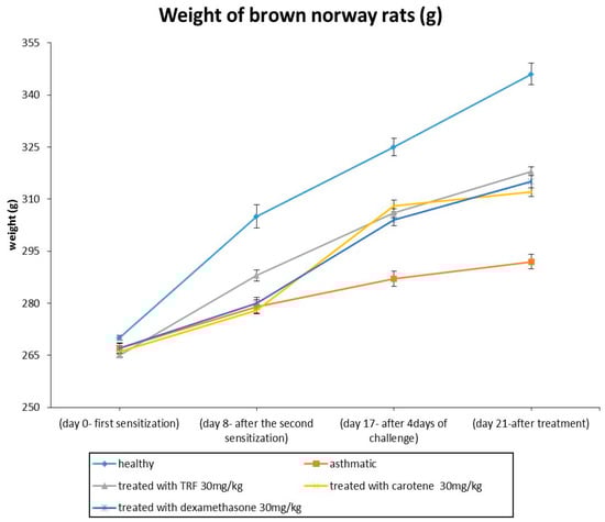 In the present study incorporating an animal model of asthma, female Brown Norway rats were injected with OVA from chicken egg to stimulate an immunological hypersensitivity effect of collagen, leading to the development of upper respiratory tract inflammation in the rats to induce a strong pulmonary infection. OVA-challenged rats showed markedly higher breathing rate, along with sneezing, irritability, and lethargy. Treatment with palm oil TRF and carotenes protected against asthma by increasing the airway hypo-responsiveness and breathing rate, along with lowering tidal volume. These results indicated the good ability of antioxidants from palm oil TRF and carotenes to stimulate a bronchodilator effect, which constitutes the main objective in the therapy for asthma. Moreover, these results were almost comparable with those of the commercial drug, dexamethasone. In addition, the body weight of animals treated with TRF, carotene, and dexamethasone increased significantly, indicating the improvement of asthmatic symptoms compared to those of the induced asthmatic animals. These findings are consistent with prior report that dexamethasone consumed as medication for autoimmune diseases and as an anti-inflammatory drug might increase weight gain [].