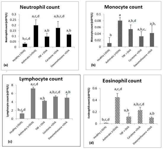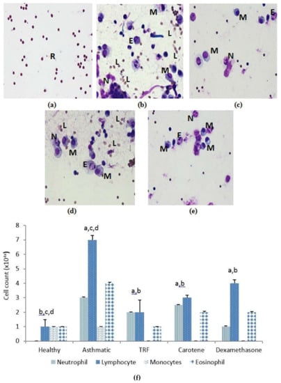 Whole blood analysis and cytology of broncho-alveolar lavage (BAL fluid) was conducted to elucidate the responsiveness of inflammatory cells upon OVA sensitization and treatment with palm oil TRF and carotene. Eosinophils, neutrophils, and especially lymphocytes exhibited substantive decrease after treatment with palm oil TRF and carotenes, compared to those of OVA-challenged rats. The healthy rats (group A) were free from inflammatory cells, which confirmed that the rats were non-asthmatic compared to the OVA-challenged group (Figure 3a–e). The reduced number of inflammatory cells following treatment with TRF and carotenes was comparable to that obtained with dexamethasone. However, palm oil carotene showed negligible effect in reducing inflammatory cells in BAL fluid (Figure 3f).