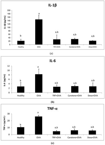 Effects of palm oil TRF, carotenes, and dexamethasone on pro-inflammatory cytokines, (a) IL-1β, (b) IL-6, and (c) TNF-α, in the plasma of Brown Norway rats challenged with OVA. Data are presented as the means ± SD, n = 10 rats per group. a P < 0.05 versus the control group. b P < 0.05 versus the OVA-challenged group.