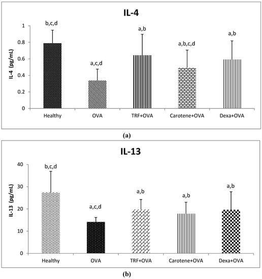 Figure 6 shows that the levels of IL-4 and IL-13 in the plasma were significantly downregulated following challenge with OVA. However, IL-4 and IL-13 levels were significantly upregulated in the rat groups treated with palm oil, TRF, carotene, and dexamethasone (Figure 6a,b). Palm oil TRF and carotene treatments increased serum levels of IL-4 by 85% and 30% and IL-13 by 39% and 26% compared to those of the control groups, respectively, whereas dexamethasone increased the IL-4 and IL-13 levels by 71% and 38.6% (Figure 6a,b). Notably, the effects of palm oil TRF and dexamethasone on plasma IL-4 and IL-13 did not significantly differ (P > 0.05), indicating that TRF is effective in increasing anti-inflammatory cytokines.