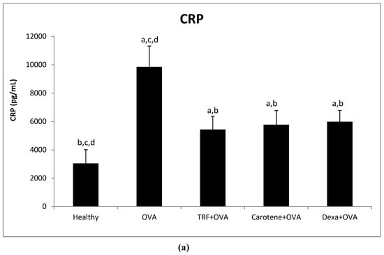 CRP constitutes an inflammatory marker comprising an important inflammation-sensitive plasma protein generated by the liver [], with the level of CRP increasing in response to inflammation coincident with IL-6 excretion by macrophages and T cells []. The present findings provide evidence that TRF and carotene exhibited strong effects in decreasing the CRP in OVA-challenged rats compared to those in the untreated group. Thus, CRP theoretically may serve as a valuable tool for identifying systemic inflammation in asthma [].