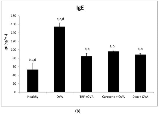 As shown in Figure 7, plasma CRP and IgE levels were significantly increased in OVA-challenged asthmatic rats. Plasma CRP level was decreased by 44%, 41%, and 39% in rats treated with palm oil TRF, carotene, and dexamethasone, respectively, compared with that in the OVA-challenged group. However, there was no significant difference between these two treatments and dexamethasone, although both treatments showed greater relative reduction in plasma CRP levels (Figure 7a). Plasma CRP levels in the OVA-challenged group were significantly (68%) higher than those in healthy rats. Moreover, treatment with palm oil TRF, carotenes, and dexamethasone reduced plasma IgE levels significantly compared to those of OVA-challenged asthmatic rats (Figure 7b).