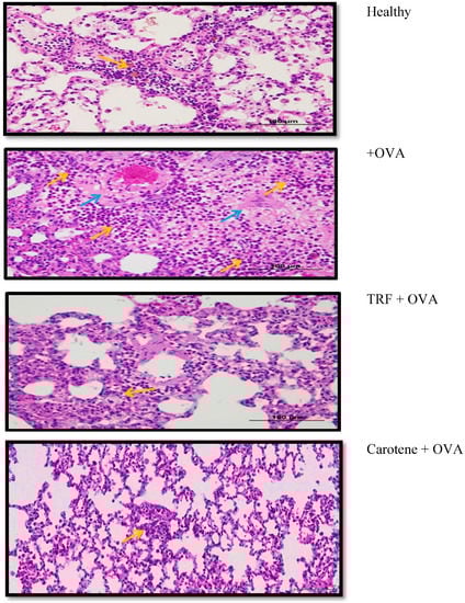 Examination of BAL fluid comprises a safe and sensitive procedure to verify diffused pulmonary inflammation at the peripheral airways and alveoli. By conducting cytology staining, the cell count in BAL fluid could distinctly differentiate between healthy, untreated, and treated groups. OVA-challenged asthmatic rats exhibited a multiplication of total cell count compared to that of treated and healthy groups. Fewer inflammatory cells were observed in rats treated with palm oil TRF and carotenes. Notably, lymphocytes, eosinophils, and neutrophils are indispensable for the pathogenesis of asthma []. Fahy et al. [] demonstrated that higher numbers of lymphocytes, monocytes, eosinophils, and neutrophils are detected in patients with asthma. In contrast, our findings demonstrated that the cell counts of all these cells decreased significantly after treatment with palm oil TRF and carotenes. These results are consistent with a study by Wagner et al. [], who showed that treating OVA-sensitized Brown Norway rats with γ-tocopherol, a potent antioxidant, decreased the accumulation of eosinophils in the septum.