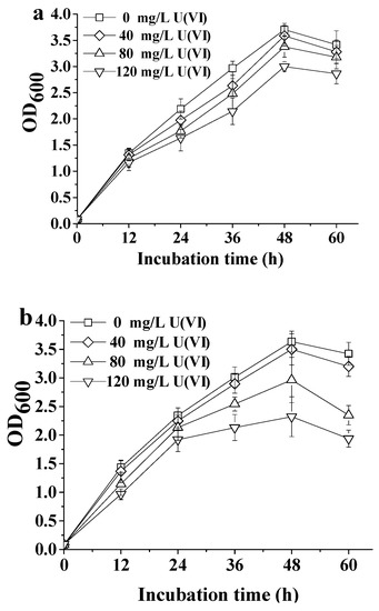 Growth dynamics of the ATCC9372 strain (a) and the Ua strain (b) in the U(VI) having growth media with different concentrations of uranium. All experiments were performed in triplicate. Average results of tree experiments were shown; bars represent standard deviations.