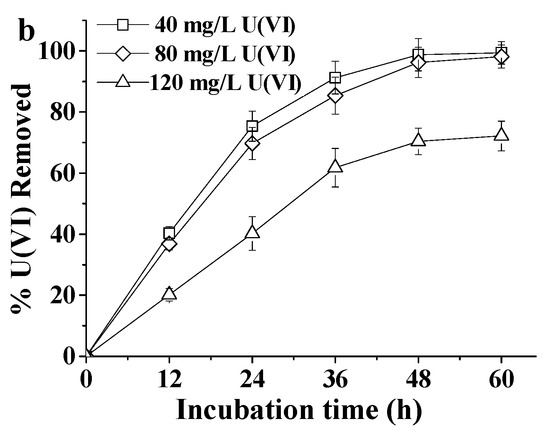 The U(VI) removal capacities of the ATCC 9372 strain (a) and the Ua strain (b). All experiments were performed in triplicate. The average results of three experiments were shown; bars represent standard deviations.
