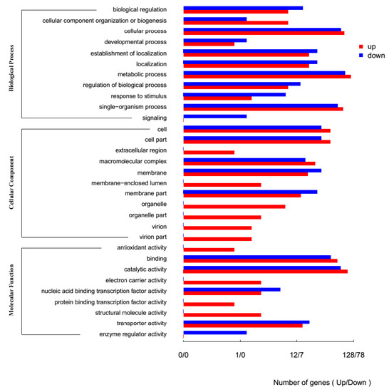 Raw RNA sequence reads were generated using Illumina HiSeq2500 equipment. After adapter clipping and quality trimming, clean reads were obtained for pools of total RNAs isolated from Bacillus atrophaeus ATCC 9372 and Ua strains, respectively. These clean reads were used in de novo assembly. The obtained contigs were assembled into unigenes after the splicing of sequences and the removing of redundancies. All clean reads for each group were compared to the genome of Bacillus atrophaeus 1942 strain (http://www.ncbi.nlm.nih.gov/nuccore/310867486?report=fasta) (Table 1). In general, the ratio of mapping of all clean reads should show over 60% similarity with other strains of the same species. If the ratio is beyond 70%, the two samples are considered to have high homology [21]. As shown in Table 1, both Bacillus atrophaeus strains, ATCC 9372 and Ua, showed high homology with Bacillus atrophaeus 1942. The unigenes from control and experimental samples were annotated by Gene Ontology (GO). All unigenes were divided into three main categories: (i) molecular functions, (ii) cellular components and (iii) biological processes. These three main categories in turn comprised more than 40 subcategories. In the biological process category, the single-organism and cellular processes were the most represented subcategories.