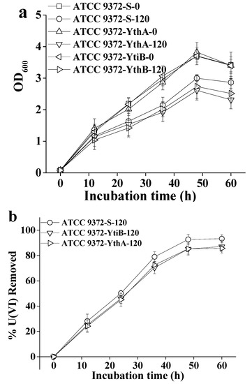 The generation of transgenic strains using ATCC 9372 as the recipient strain was carried out as described in Materials and methods. Recombinant expression vectors were verified by restriction enzyme digestion with MluI and XbaI. The growth dynamics of ATCC 9372-ytiB and ATCC 9372-ythA transgenic strains and the ATCC 9372-S negative control strain, as well as their U(VI) removal capacity at 120 mg L−1 of U(VI) in the growth media are shown in Figure 5. All experiments were repeated three times, and averaged results were used in the figure.