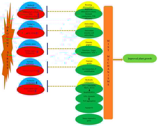 On the left side drought stress negatively impacting plant growth by secondary osmotic, oxidative stresses, reduced photosynthesis, hydraulic and nutrient conductivity. On the right side major microbial induced systemic tolerance (MIST) mechanisms displayed by microbes enhancing plant growth during drought stress.