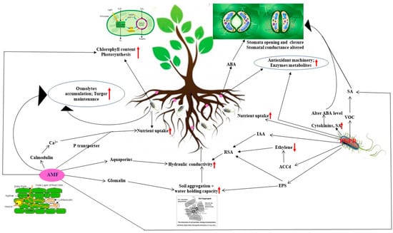 The altered physical and biological properties of soil due to water deficit impedes the plant growth. Among the chief physiological mechanisms for upgraded MIST in plants during water deficit conditions could be attributed to boost in hydraulic conductivity of roots or water relations. Extraradical hyphae of AMF are engaged in water uptake and nutrient translocation [] which is more significant during water deficit conditions as these hyphae are capable of invading soil pores that are impervious to root hairs. The movement of water through AMF hyphae is apoplastic as water absorbed by the extraradical hyphae from the soil is transferred to cortical apoplast which then adjoins water passage through root apoplastic pathway []. Extensive root system of AMF hyphae increase the exposure area in soil around plant host which directly alters relative water potential, RWC [] and transpiration rate in plants []. Moreover glomalin formation as a result of AMF colonisation also affects water relations during drought stress [,]. Glomalin quantified as glomalin-related soil protein (GRSP) is a glycoprotein formed by AMF spores and hyphae in soil and roots. It acts a glue which is involved in soil aggregate formation, carbon sequestration and water retention []. AMF have the ability to structure microchannels or regulates the connectivity of pore spaces, that serves as a close water passage across air zones with direct connection to roots []. An elevation in level of GRSP and aggregate stability was observed in AMF colonized orange seedlings during drought conditions []. Similar observations of elevated total GRSP (T-GRSP), easily extractable GRSP (EE-GRSP) and leaf/soil water potential were recorded in AMF inoculated Citrus tangerina seedlings than non-AMF seedlings during water deficit []. As glomalin production by AMF improves soil structure, in similar fashion EPS production by rhizobacterial strains also plays pivotal role in enhancing plant growth under water deficit via formation of hydrophilic biofilms around plant roots protecting them from soil drying hardness [,] (Figure 2). Numerous research studies have documented EPS mediated MIST in PGPR inoculated plants such as sunflower [], maize [,], wheat [,] however water holding capacity (WHC) varies according to polysaccharide components present in EPS. MIST via EPS can alleviate drought stress as it boosts root-adhering soil/root tissue ratio, RAS macroporosity and macroaggregate stability [] augmenting water and nutrient uptake from rhizospheric soil thus sustaining higher water potential in vicinity of roots. AM colonization affects the aboveground physiological processes by lowering water potential in leaves and xylem in response to reduced soil water potential which modifies stomatal conductance, transpiration rate, hydraulic conductivity and photosynthetic efficiency during water deficit conditions []. Water deficit decreases soil water levels causing stomatal closure which in turn decreases photosynthesis, however AMF colonisation increases photosynthesis by improving water stature as increased stomatal conductivity results in higher CO2 diffusion in the mesophyll cells []. Increased stomatal conductance in AM colonized plants have been confirmed in rosemary [] and rice [] under water deficit. In contrary, AM colonized white clover (Trifolium repens L.) showed reduced stomatal conductance and higher RWC [] contributing towards enhanced water use efficiency (WUE). Shifts in ABA levels increases the drought tolerance in AM plants [] as ABA alters the plant water stature via regulating transpiration rate, stomatal conductance and induction of stress tolerance genes. ABA content was found to be higher in non AMF plants as compared to AMF plants indicating less drought stress experienced by non AMF plants [], however variations in stomatal conductivity and photosynthesis depend on host and fungal species. ABA pivotal role among non-nutritional mechanisms affecting stomatal conductance during drought in AM plants has been suggested [] and will be discussed later in phytohormone section. It was confirmed that ABA independent stomatal closure in P. chlororaphis O6 treated plants []. Reduced stomatal apertures were observed in inoculated wild-type as well as ABA-insensitive Arabidopsis mutant plants that reduced transpiration levels thus enhancing MIST to drought in host plants. ROS production damages the photosynthetic machinery hence reducing photosynthesis during water deficit, however microbial inoculation can enhance tolerance in host plants as it improves plant water stature which boosts photosynthesis via increased stomatal conductance []. Increased photosynthesis in rhizobacterial or AMF inoculated plants can be attributed to increase in photosynthetic pigments and more efficient photosynthetic machinery []. Elevation in photosynthetic pigments in AMF treated plants during water deficit has been recorded in the Tagetes erecta L. [], Erythrina variegata Linn. [], Ipomoea batatas (L.) Lam. [] and citrus []. Moreover, decreased content of sugars and starch was observed in addition to elevated level of photosynthetic pigments (chlorophyll and carotenoids) in AMF Glomus versiforme inoculated Poncirus [] and F. Mosseae colonized Erythrina hence confirming sugar removal to enhance sink strength of AMF fungi via increased photosynthesis.