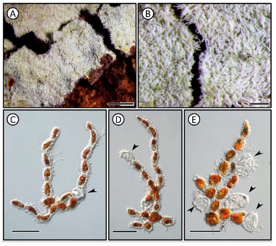 - Rindi, F.; Guiry, M.D. Diversity, life history, and ecology of Trentepohlia and Printzina (Trentepohliales, Chlorophyta) in urban habitats in Western Ireland. J. Phycol. 2002, 38, 39–54. [Google Scholar] [CrossRef]