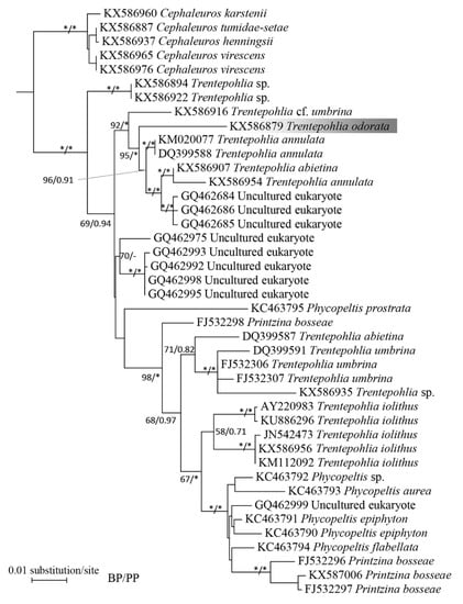 The maximum likelihood phylogram inferred from 18S rDNA sequences of Trentepohliales. The monophyletic genus Cephaleuros was used as outgroup. Maximum likelihood bootstrap values (1000 replicates) and Bayesian posterior probabilities (PPs) are given near the nodes, and only bootstrap proportion (BP) and PP values above 50 and 0.50 are shown. The full statistical support (100/1.00) is marked with an asterisk. The Trentepohlia odorata was shaded in grey.