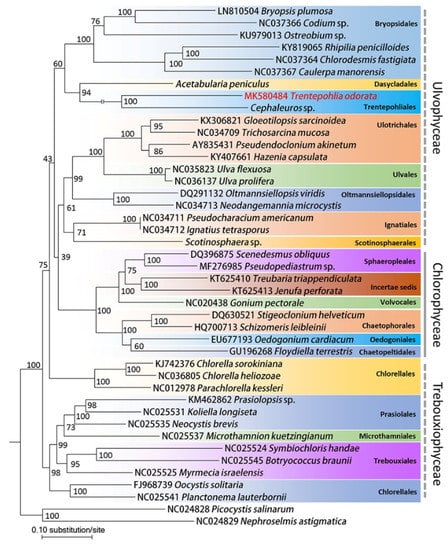Algae in the order Trentepohliales are characterized by uniseriate and branched filaments. The order contains five genera and approximately 80 species that are primarily found in tropical and subtropical areas, and many of them form masses of a striking color (such as orange, yellow, and red) on tree trunks, walls, and stones [1]. Since the recorded species are completely aerial or subaerial, Trentepohliales is a special group in Ulvophyceae, of which the other groups are mainly composed of seaweeds or freshwater algae. The order can be easily distinguished from other ulvophycean algae by its specific sporangiate-lateral. Other special morphological and ultrastructural features include the absence of pyrenoid in the net-like chloroplasts, plasmodesmata in the septa, and a phragmoplast similar to Streptophyta visible during cytokinesis [2]. As the type genus of Trentepohliaceae, Trentepohlia Martius is the earliest known and most studied. Several studies have confirmed that Trentepohlia are polyphyletic groups [3,4,5,6]. There are more than 46 valid Trentepohlia species recorded in AlgaeBase [1]. Among all the Trentepohlia species, T. odorata (F.H. Wiggers) Wittrock is a controversial species since several phycologists considered this species synonymous with T. umbrina or T. iolithus, whereas most phycologists treated T. odorata as valid separate species [7,8,9,10]. Moreover, the current molecular data (i.e., 18S rDNA, rbcL cpDNA) available has shown that several species in Trentepohlia are also polyphyletic, especially several widespread and common species, i.e., T. arborum and T. umbrina [5,6]. Additionally, the morphology and phylogenetic position of Trentepohlia odorata has rarely been reported.