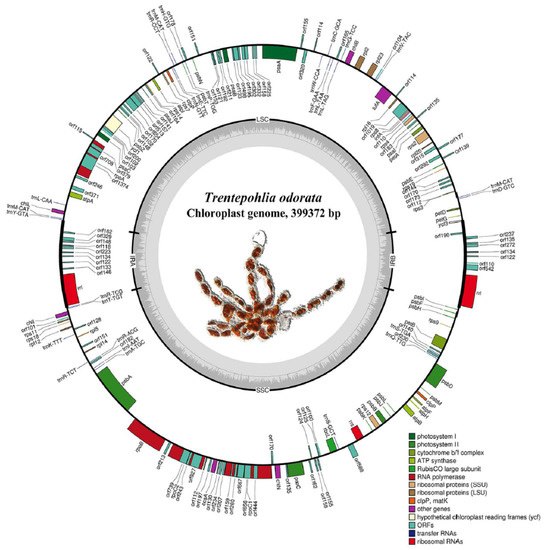 Recent studies based on genome-wide data or multigene chloroplast data revealed that the Ulvophyceae is not monophyletic and was recovered as two or more distinct clades [11,12,13]. However, there are only several different chloroplast coding genes available in the database (i.e., GenBank), and no whole chloroplast genome of Trentepohliales has yet been reported. Chloroplasts in species of Ignatiales, Ulotrichales, Oltmannsiellopsidales, and Ulvales have been reported to share a similar structure with most Viridiplantae, of which the circular plastome was composed by two inverted repeat regions (IRa and IRb) and two single copy regions (LSC and SSC) [12,14,15,16]. The sequenced chloroplast genome of the BCDT clade (Bryopsidales, Cladophorales, Dasycladales and Trentepohliales) have unique plastome structures. For example, the chloroplast genome of a species of Cladophorales was reported to consist of 34 small hairpin chromosomes and lost many genes [17]. All available chloroplast genomes of Bryopsidales lack a large inverted repeat region [18,19]. In comparison with the relatives of Trentepohiales, there is little known about the evolution and chloroplast genome of the order. Thus, it is important to sequence the entire chloroplast genome of a species within Trentepohliales to increase our knowledge about the order.