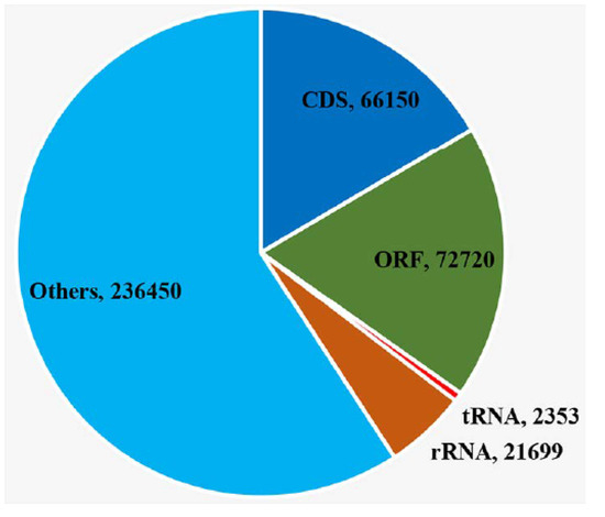 The size of CDS (protein coding regions), ORF (open reading frames, >100 aa), tRNA, rRNA and other regions in Trentepohlia odorata chloroplast genome. The number represents its size (bp).