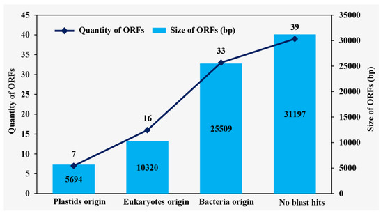 The genes were grouped into two major categories, coding genes and non-coding genes. The coding genes consisted of 63 predicted protein-coding genes, including five atp genes, four chl genes, four pet genes, five psa genes, 15 psb genes, seven rpl genes, four rpo genes, 11 rps genes, two ycf genes, and six other genes (ccsA, two clpP, infA, rbcL, and tufA). The non-coding gene category included 31 tRNAs and three rRNAs (Table 1). We annotated a total of 49 introns, of which 39 group I introns were present in eight genes (rrl-IRa (8), rrl-IRb (8), rrs (2), psaA (2), psbA (3), psbC (5), psbD (3), petB (4), and rbcL (2)), nine group II introns in eight genes (rpl2, rps12, psaA (3), psbA, psbD, psaC, petB, and tufA), and one unidentified type intron (rpoB). The IR regions contained only two of the same rRNA gene (rrl) and no other genes. Additionally, we detected that the rrs gene was not located in IR regions but had only one copy in the SSC region. The ycf3 gene was located across LSC region and IRb region; however, there was only a partial sequence of this gene detected in the IRa region. We annotated two copies of clpP in the LSC region and SSC region, respectively. Additionally, there were 95 free-standing ORFs (length >100 aa) annotated in the intergenic region, with a total length up to 72,720 bp (18.21%) (Figure 6). Among the free-standing ORFs, seven were annotated with plastid origins (POP), 16 with eukaryotic genome origins (EOP), and 33 with bacterial genome origins (BOP) (Figure 7). Four genes (rpoA, rpoB, rpoC1, and rpoC2) were annotated within four ORF clusters (including partial ORFs). All four genes were fragmented into several ORFs by in-frame stop codons (Figure 8, red asterisks). There were three fragments annotated in rpoC1, three in rpoC2, eight as rpoB, and two as rpoA. In the rpoB ORF cluster, we detected a frame shift mutation (Figure 8, arrow).